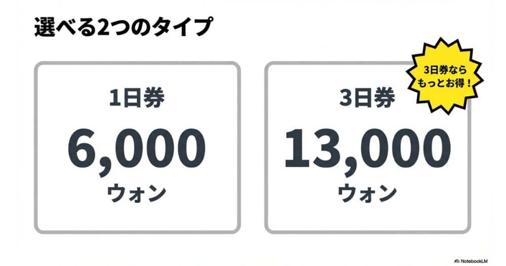 | 1日乗車券 (1-Day Pass) | 6,000ウォン | 初回改札日「当日」限り有効(24時間制ではありません)。 朝から晩まで地下鉄に4回以上乗るアクティブな日におすすめです。 |