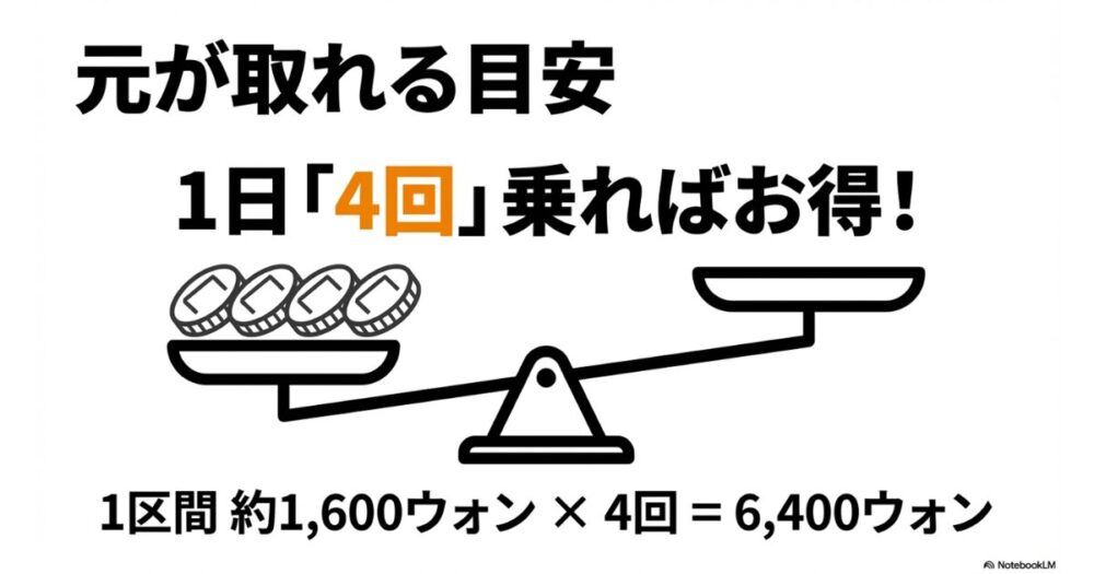 例えば、1日乗車券(6,000ウォン)を購入した場合、1区間の移動でも4回乗車すれば(1,600ウォン × 4回 = 6,400ウォン)、元が取れる計算になります。