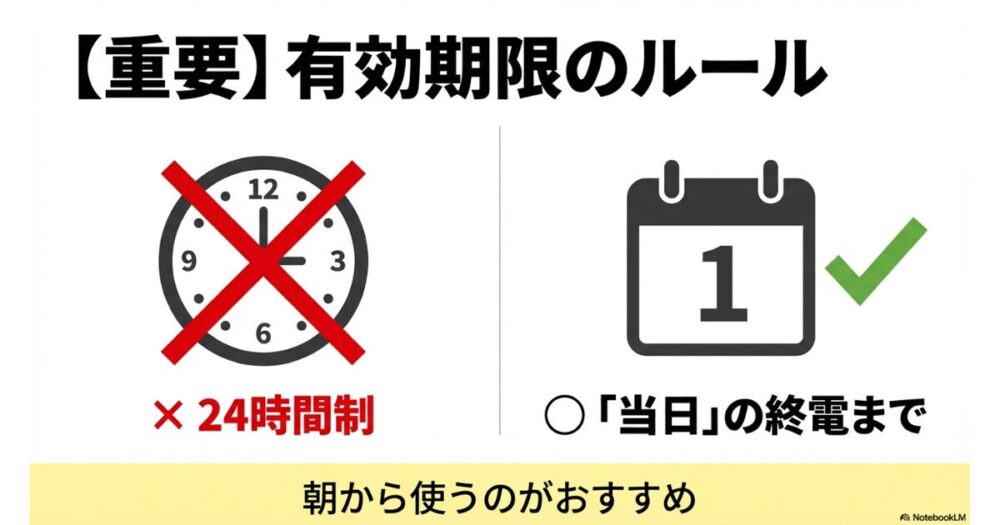 1日乗車券を利用する上で、最も勘違いしやすく、かつ致命的な失敗につながりやすいのが「有効期限」のルールです。ここだけは絶対に覚えておいてください。