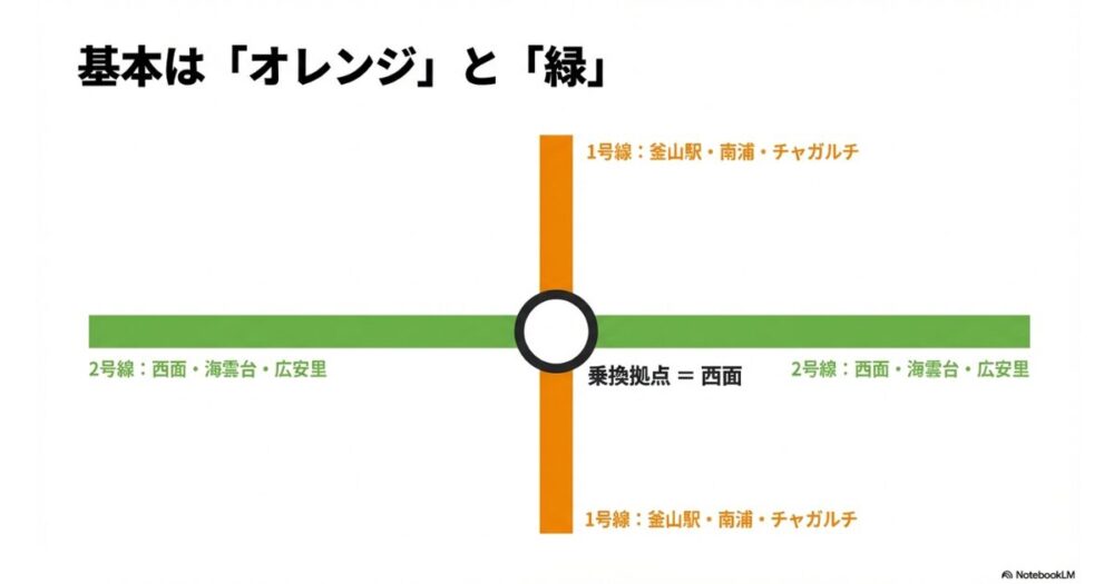 | 2号線 | 🟩 グリーン | 【ビーチと若者のルート】 西面、広安里(広安駅)、センタムシティ(BEXCO)、海雲台、冬柏。 海沿いのリゾートエリアを巡るならこの路線が必須です。 |