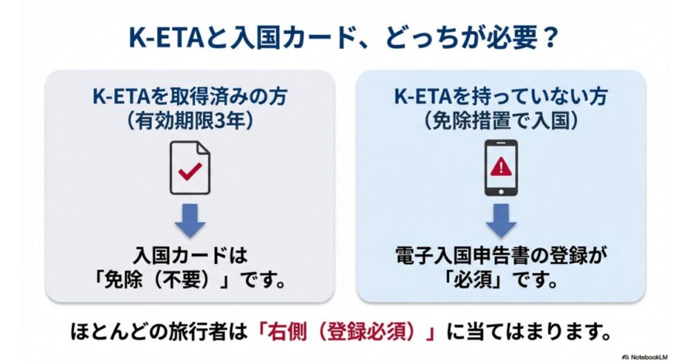 簡単に言うと、K-ETAは「韓国に渡航する許可」、入国カードは「入国時の身元と滞在先の申告」です。