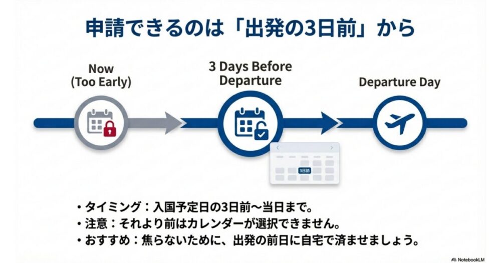 - 出発の3日前から前日までに、自宅などの落ち着いた環境で申請を済ませる