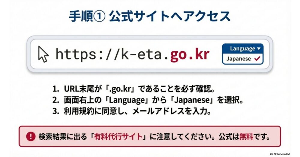 - 申請は韓国政府公式の無料サイト(.go.kr)で行う