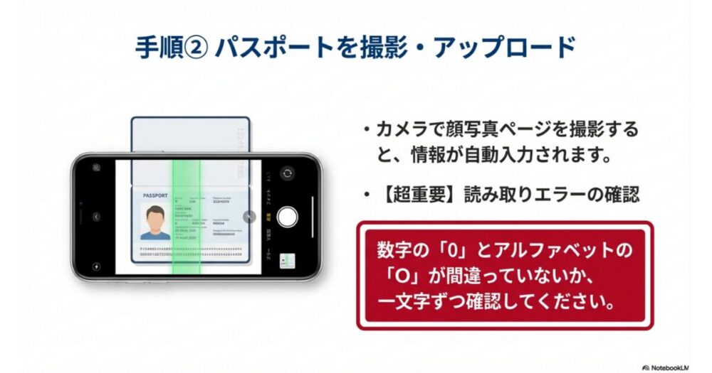 自動入力された情報が、実際のパスポートの記載と一言一句合っているか、必ず目で見てダブルチェックしてください(特に「0(ゼロ)」と「O(オー)」の誤認識に注意)。
