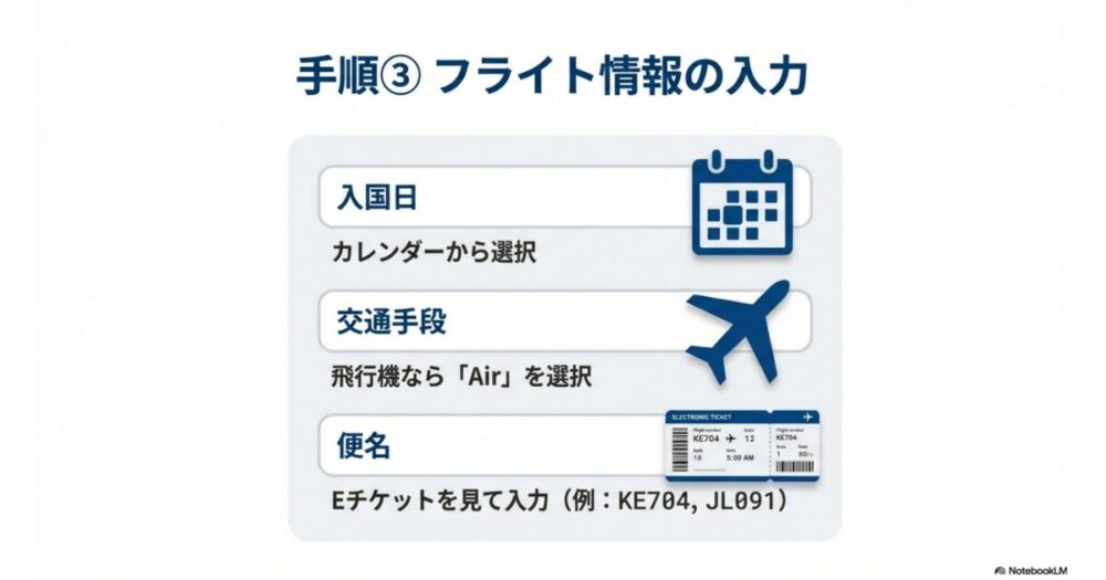Eチケットを確認し、搭乗する飛行機の便名(例:KE704、JL091など)を入力します。