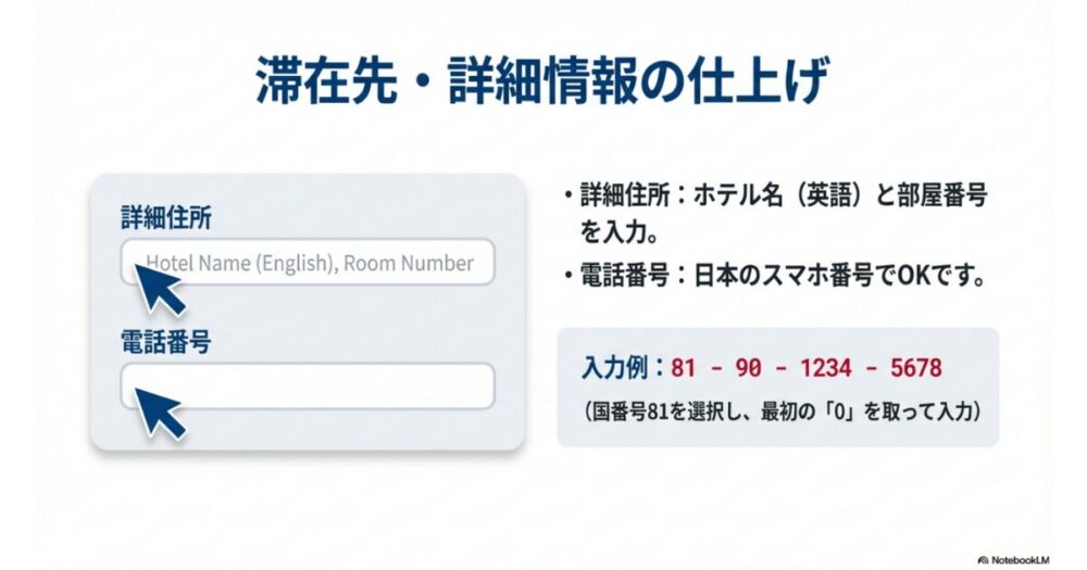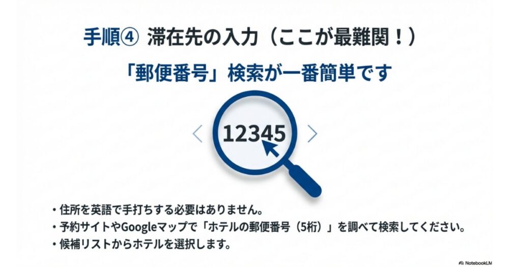 - つまずきやすい滞在先住所の検索や英語入力の具体的なコツ