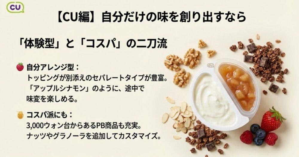 韓国では今、「トッピング経済」という言葉が生まれるほど、ベースとなる食品に追加して楽しむトッピング商品が充実しています。コンビニのヨーグルト棚のすぐ隣には、魅力的なオプションがずらりと並んでいるはずです。