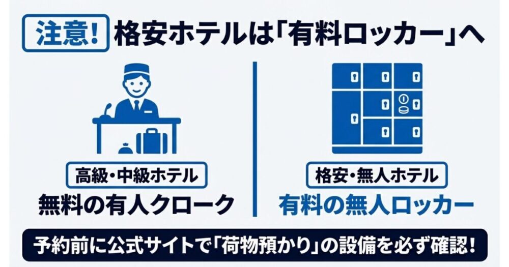 宿泊費を抑えたバジェットホテル(格安ホテル)や、無人チェックインシステムを導入したスマートホテルでは、フロント業務のコストカットを目的に、有人での預かりを廃止している場合があります。