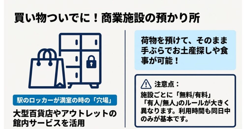 「駅のロッカーが空いていない…」というときでも、こうした商業施設を候補に入れておくと、意外とスムーズに動けることがあります。買い物や食事もまとめて済ませやすいので、覚えておくと便利ですよ。