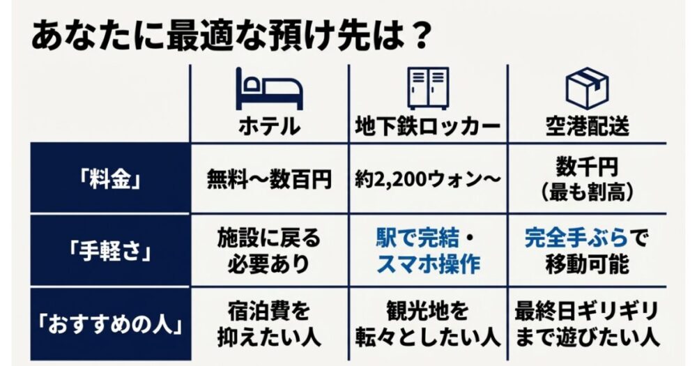 いかがでしたでしょうか?韓国のホテルにおける荷物預かりの基本から、最新のロッカー事情、そして便利な配送サービスまで幅広くお伝えしました。