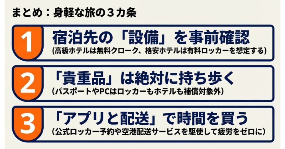 ここでは、駅の便利なロッカーや、重い荷物を直接空港へ送ってしまう配送サービスなど、ワンランク上の身軽な旅を実現する応用テクニックをお伝えします。