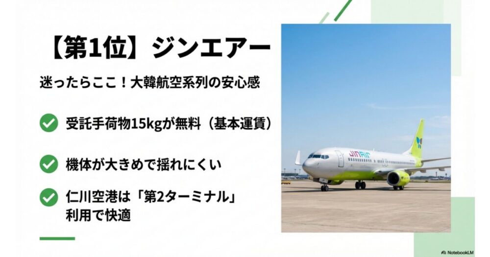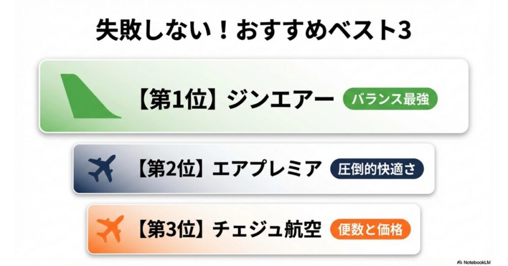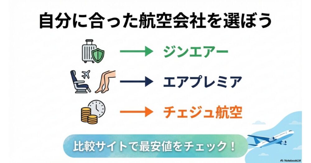 「今回は買い出し旅行だから、荷物がたくさん積めるジンエアーにしよう」「とにかく移動で疲れたくないから、広々としたエアプレミアで」「学生旅行で予算重視だから、チェジュ航空のセールを狙おう」といったように、自分の旅の優先順位を決めて選ぶことで、旅の満足度は格段に上がります。