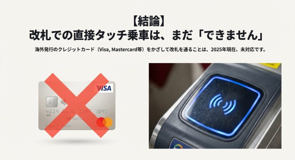 海外発行のクレジットカード(Visa, Mastercard, JCB, Amexなど)を改札にかざしても、エラー音が鳴るか、全く反応しません。