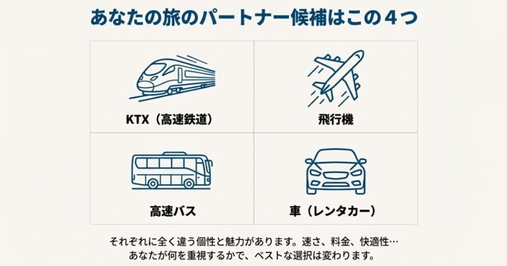特に初めて韓国を縦断する方は、移動手段選びで失敗したくないはずです。私自身、この区間を行き来していますが、目的によってベストな選択肢は毎回変わります。