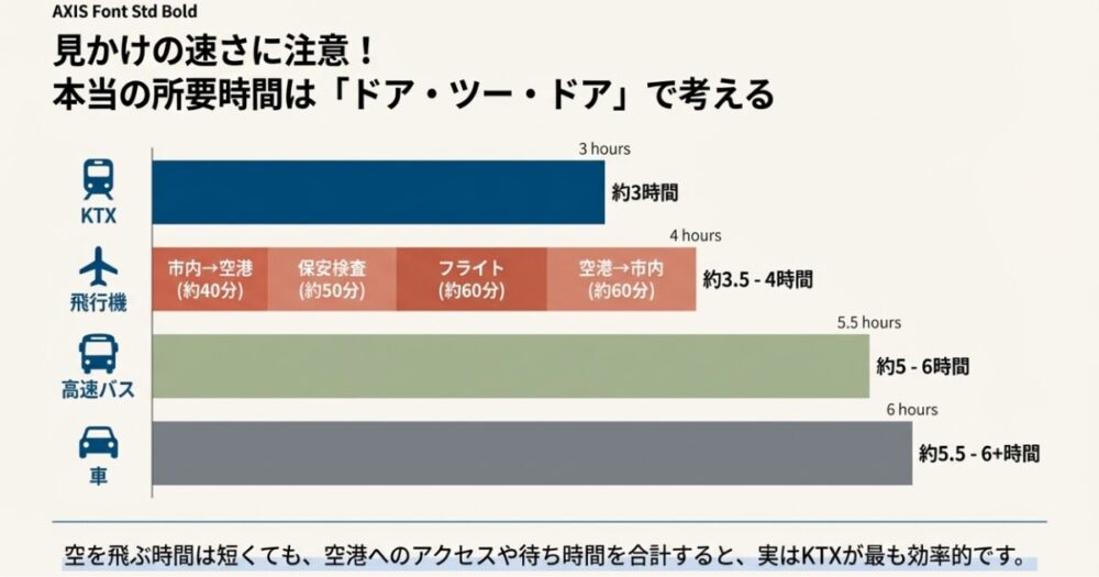 - KTX、飛行機、バス、車ごとの所要時間と料金比較