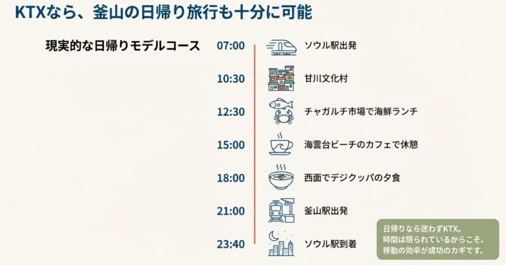 日帰りなら、迷わずKTX(またはSRT)の始発に近い便と、終電に近い便を予約しましょう。