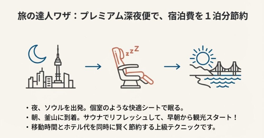 寝ている間に釜山に着き、早朝からサウナでリフレッシュして観光開始…なんてプランも通っぽくて良いですよね。