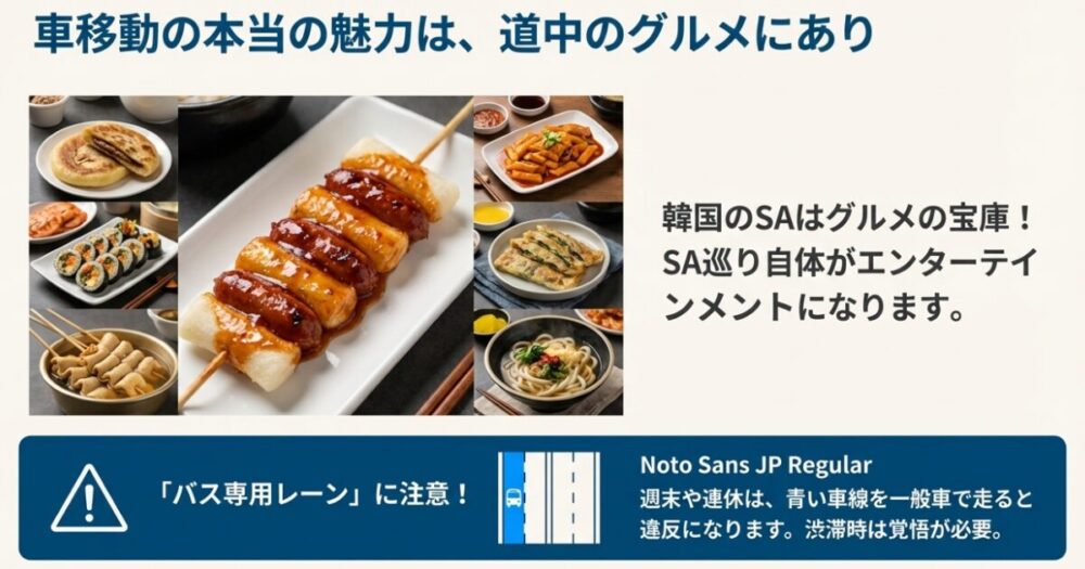 一つ重要な注意点があります。京釜高速道路には「バス専用レーン(青い車線)」があります。